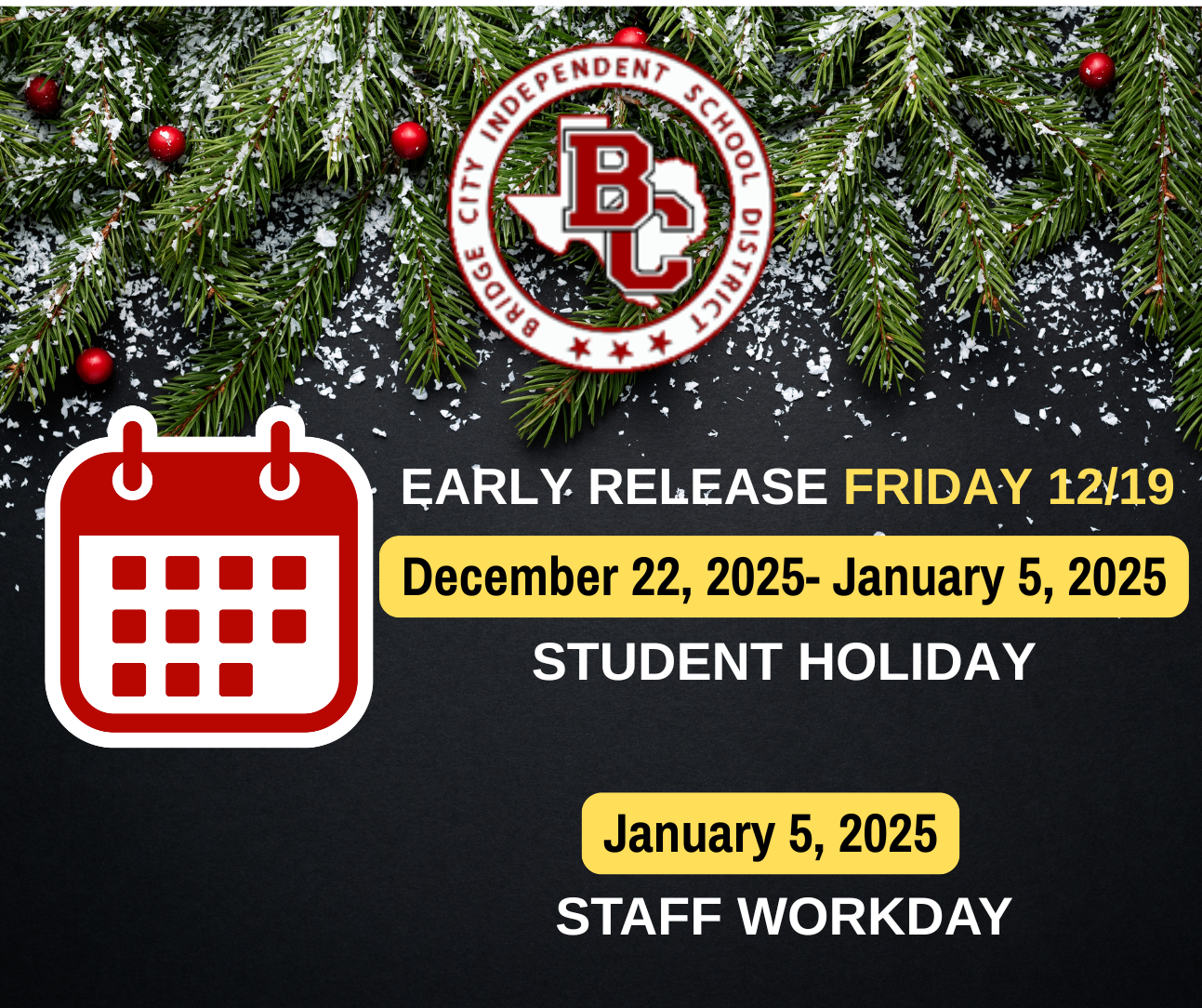 REMINDER: We have an early release this Friday (December 19). Following the early release, our Christmas Break officially begins! We look forward to welcoming all students back on Tuesday, January...